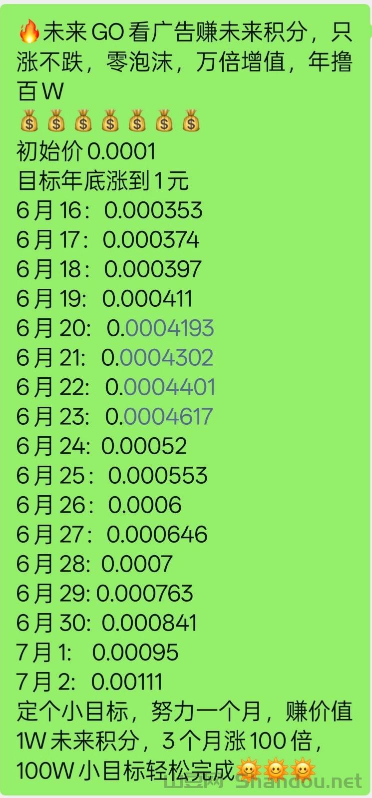 正文 未来GO,一条广告保底0.3元 admin V管理员 /01-04/4阅读/0评论 0104 未来go ,保底一个广告0.3看广告得贡献值贡献值换未来积分未来积分时间越久价格越高未来积分兑换红包直接提推广10层见点奖微信扫码注册邀请码wwidnan4 声明:本站提供的内容信息和网络资源均来自网络收集整理和用户投稿,仅限用于学习和研究目的,不得将上述内容用于商业或者非法用途,否则后果自负,版权争议与本站无关。若为网络资源,用户须在下载后24小时内删除,若您喜欢该网络资源,请支持正版,付费购买后可得到更好的正版服务。我们非常重视版权问题,如有侵权请与我们联系处理。