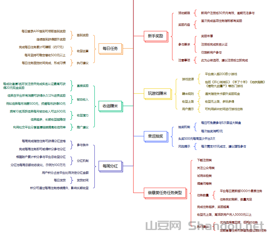 发任务,做任务,签到,幸运抽奖,玩游戏,看视频,各种新手奖励,推广奖励,终生进贡奖励,平台分红,如此优秀的悬赏平台,此时不参与更待何时?无论你是寻找兼职机会的学生、想要增加家庭收入的家庭主妇/夫,还是希望通过互联网创业实现财务自由的梦想家,山豆米米都将是你不可多得的选择。立即行动起来吧,开启属于你的财富增值之路!